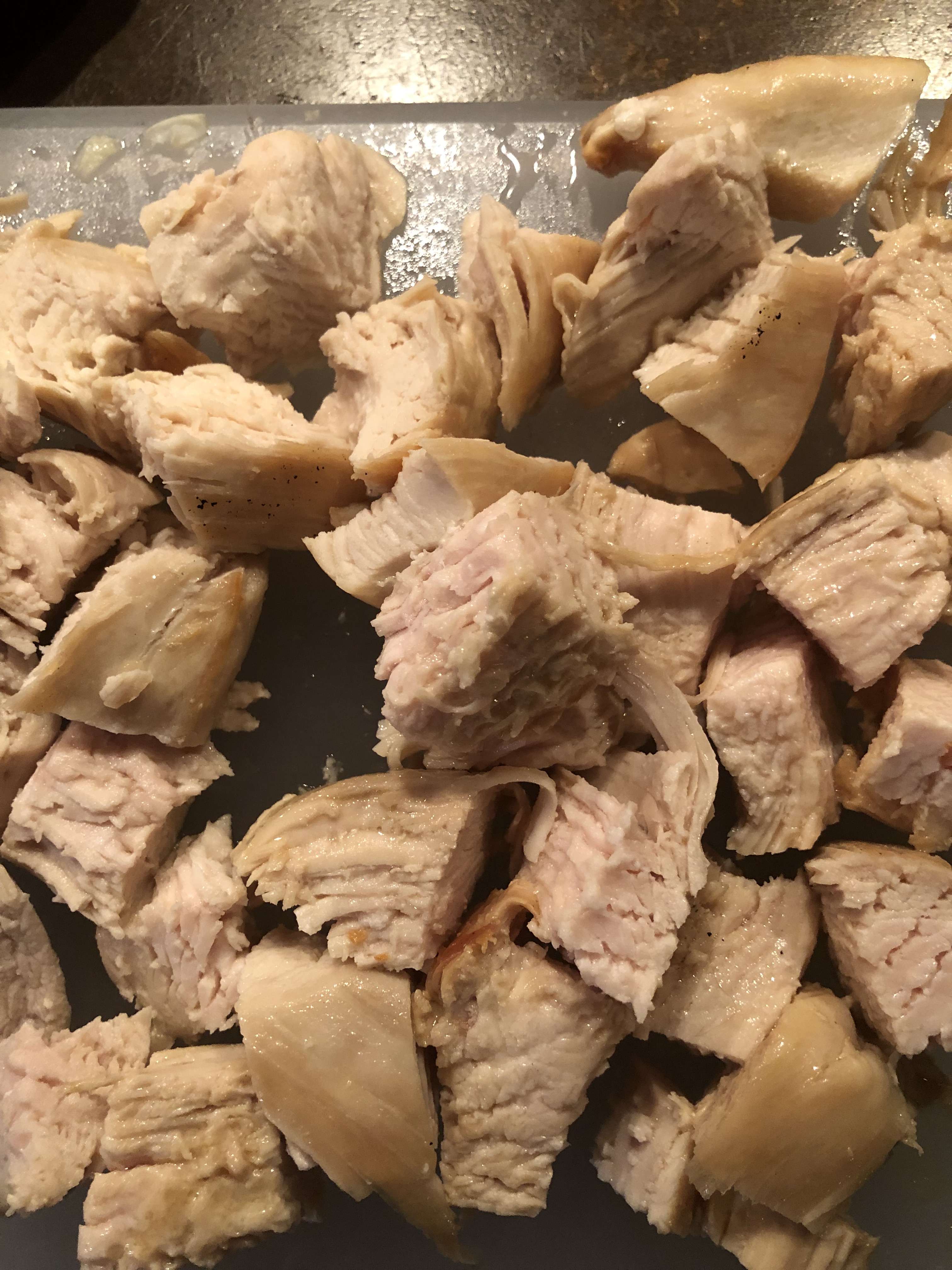 In a small ovenproof dish, cook the chicken till just cooked through. Or, sear and cook over low heat on your stove top. However you want to cook it, that’s fine. Once its cooked, remove from heat and allow to cool slightly.