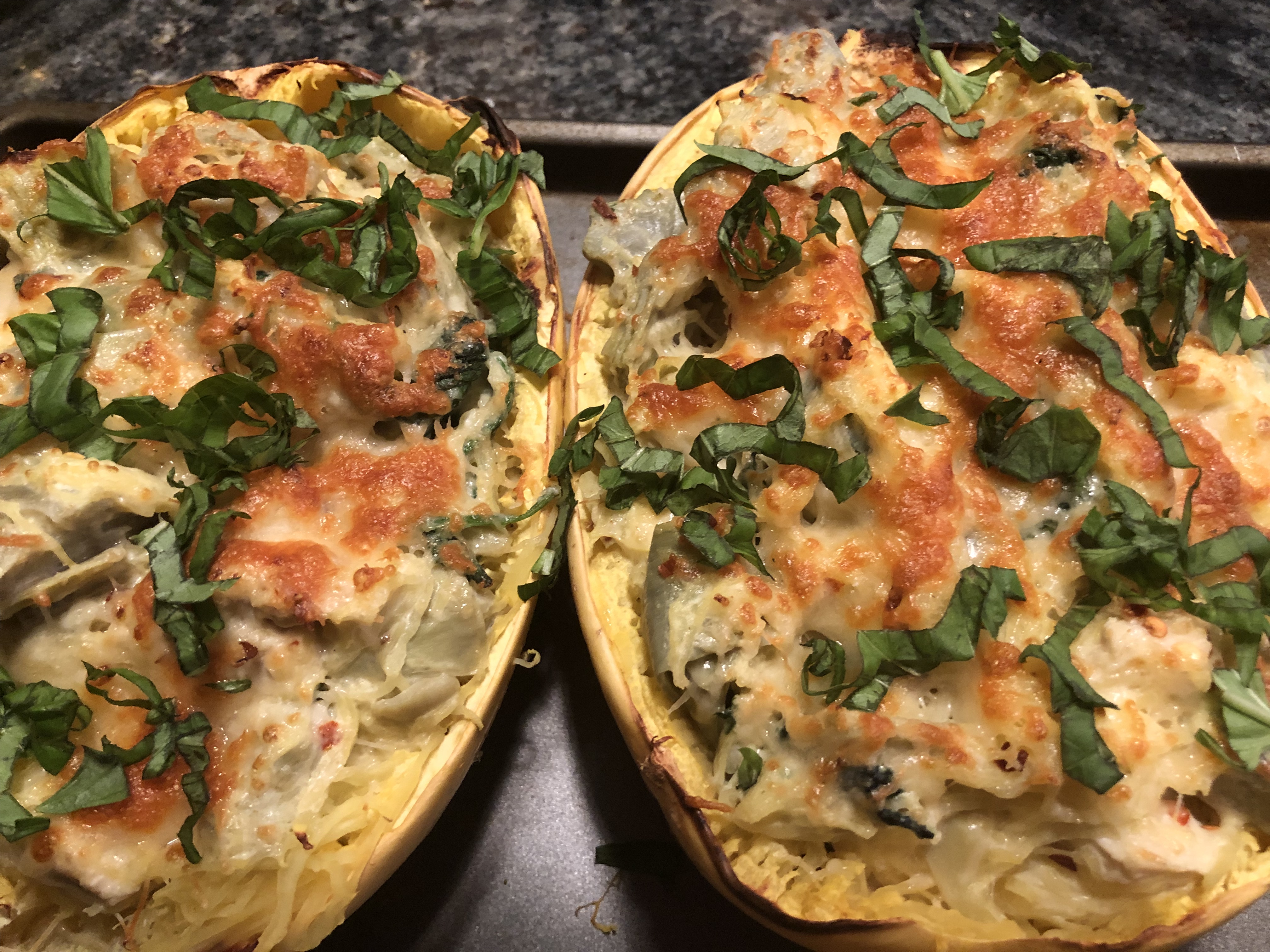 Creamy Baked Spaghetti Squash with Spinach and Chicken.