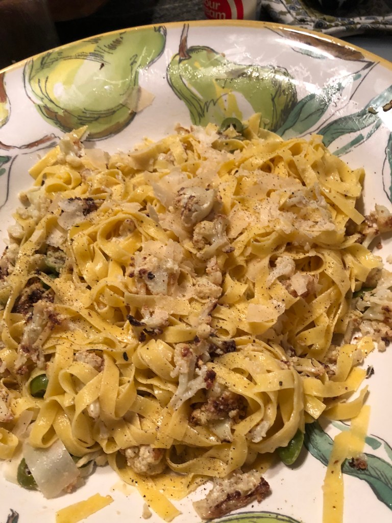 When cauliflower is done, add to large pasta bow. Quickly toss with creme fraiche. Add hot pasta to bowl. Toss in olives. Drizzle with more EVOO. Stir. Top with Parmesan. Serve with salad and crusty bread if so inclined.