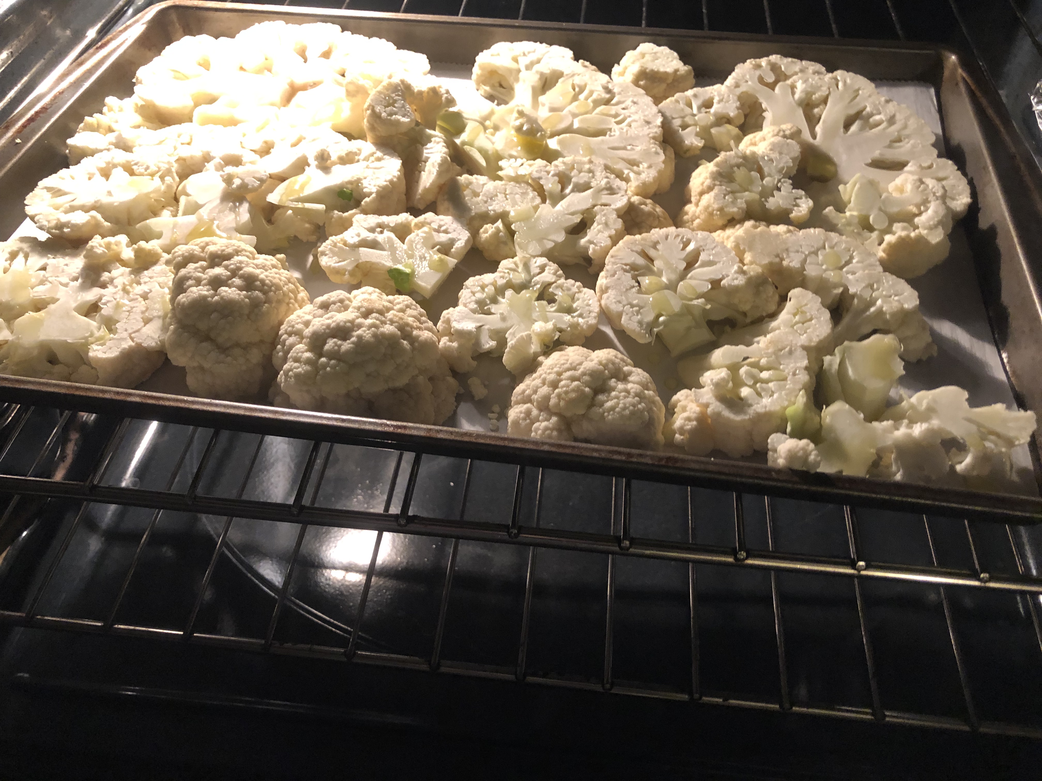 Take the head(s) of garlic and remove the outermost skin. Cut off the top 1/4 inch of the head so cloves are exposed. Place onto square of tinfoil. Drizzle with olive oil. Pinch closed and place onto cookie sheet with cauliflower. (I like to do a few heads at a time. Easy to add deep flavor to dressings, smash into bread with olive oil, etc. And cuts down on work!)