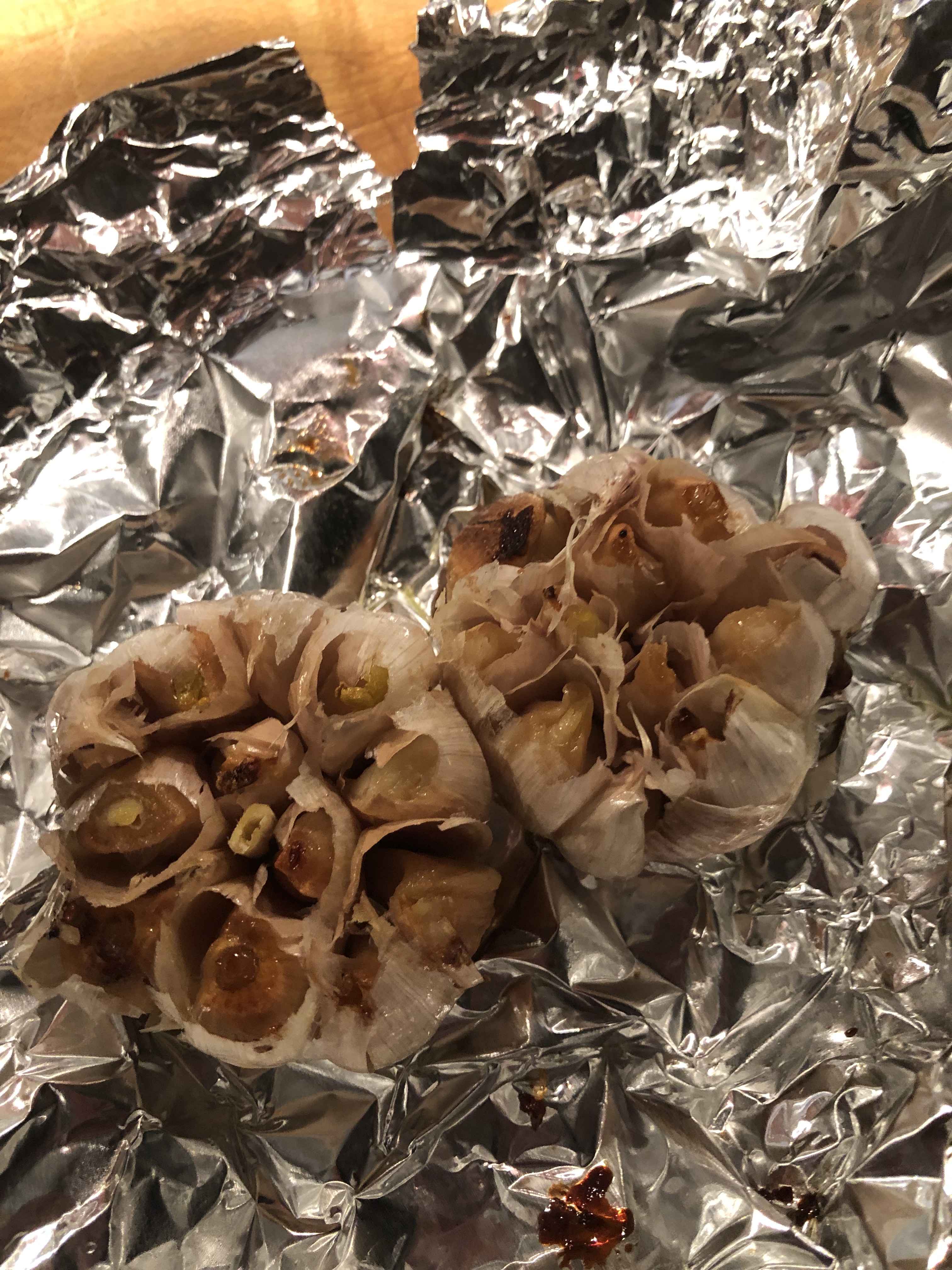 Watch the garlic after about 20 minutes. It will be soft and easily squeezed out from husk/skin. When it is finished, remove from oven to cool.
