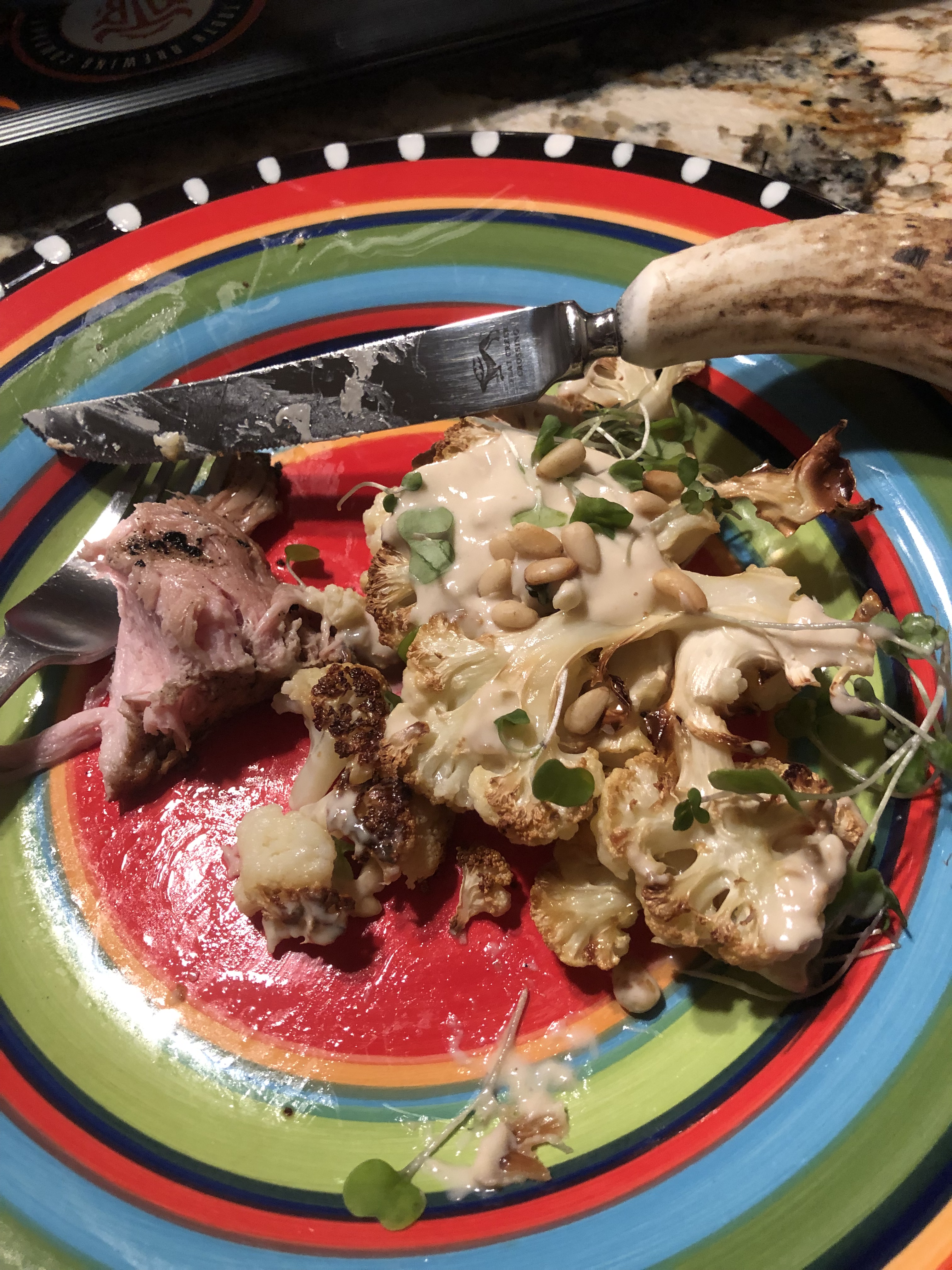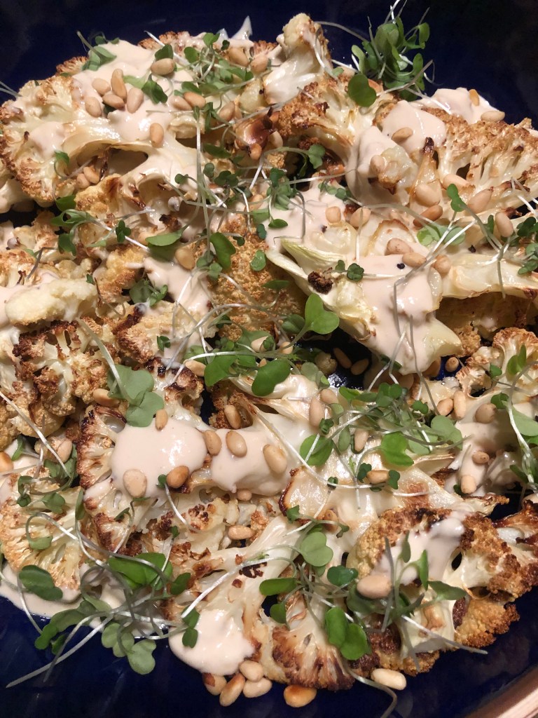 Place the cauliflower steaks onto a platter. Drizzle the Tahini sauce over the steaks. Top with micro greens and toasted pine nuts.