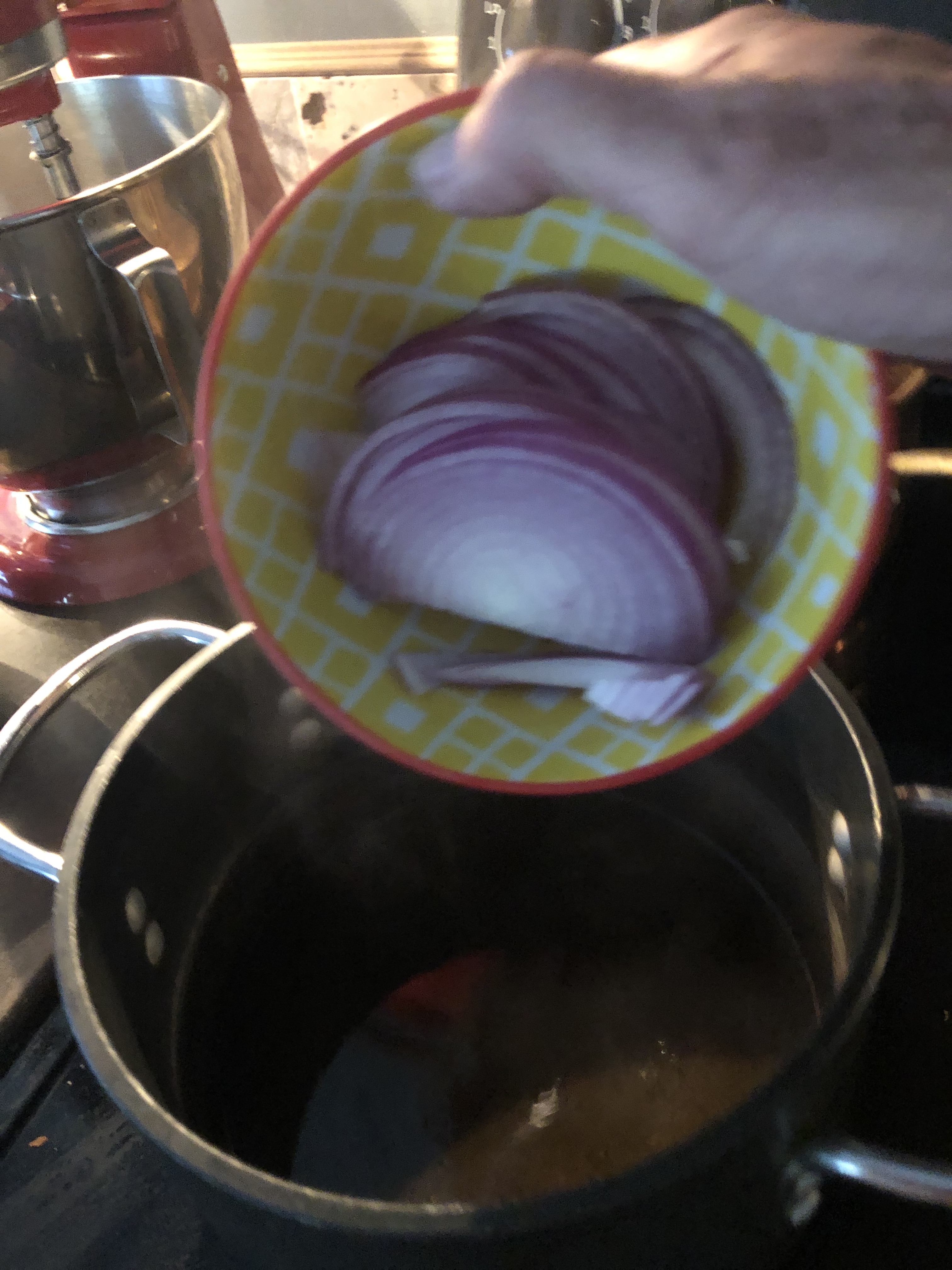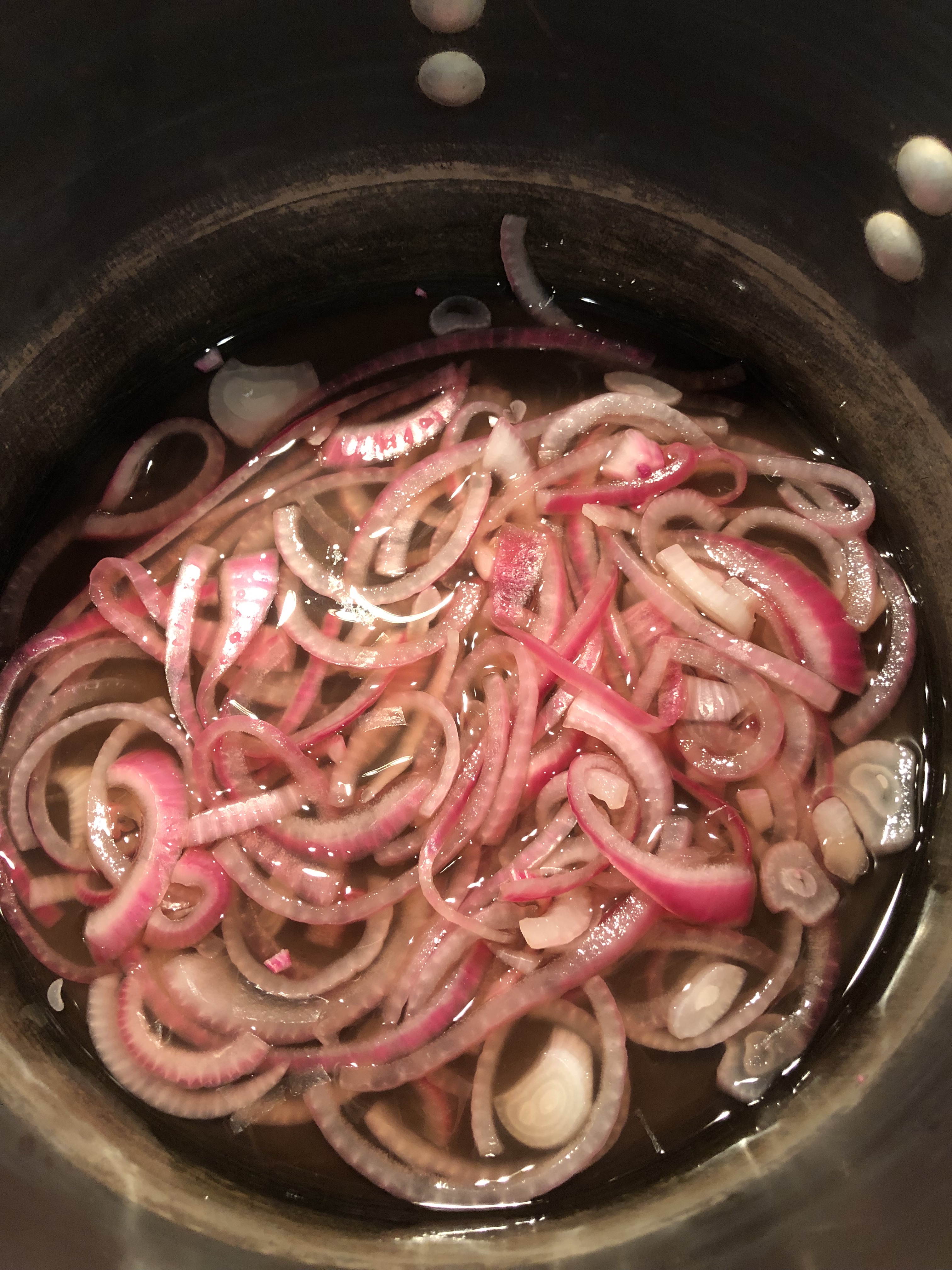 For the quick pickled onions: Take the red wine, water, pinch of kosher salt and Stevia and place into medium pot on medium heat on stove. Bring to boil. Remove from heat and add the onions.