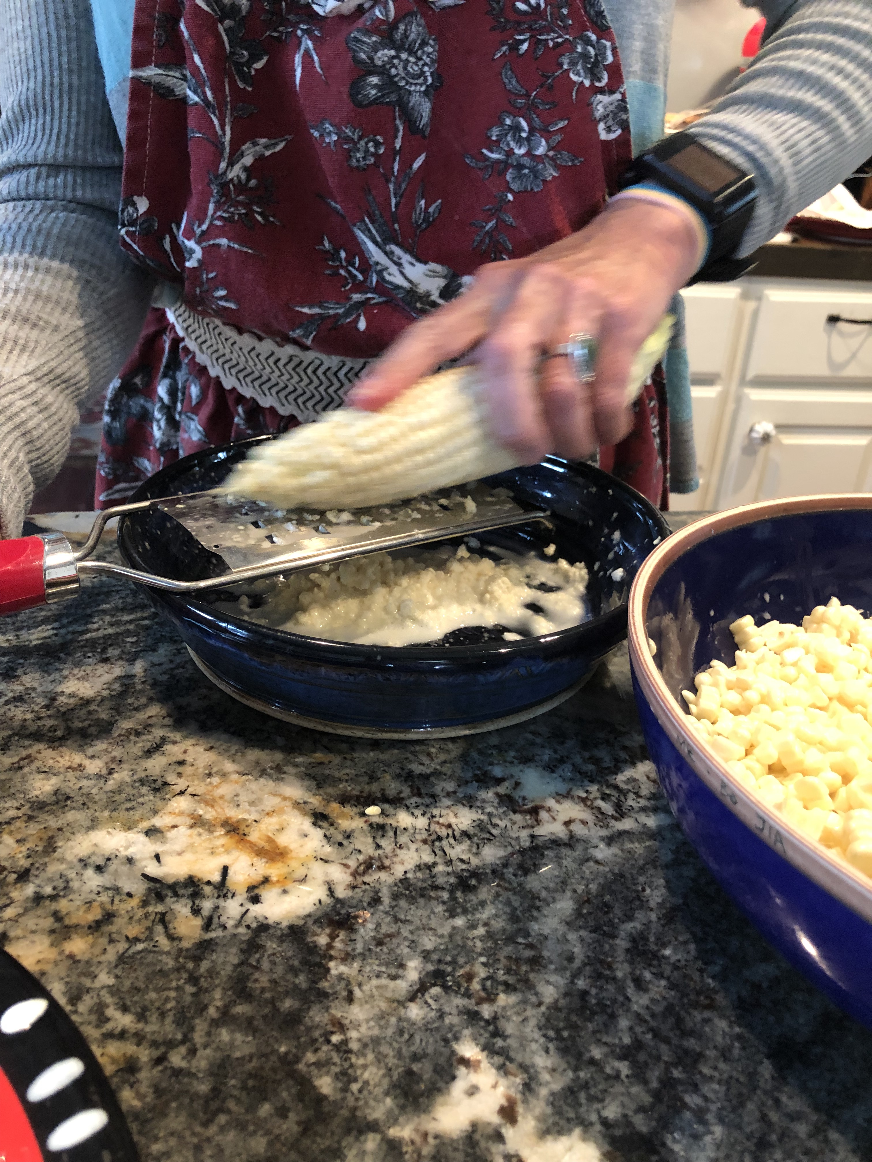 On to the Creamed Corn: For 4 of the ears of corn, slice off the kernels and set aside. On the remaining 2 ears, grate them with a box grater. (No flour here! The grated corn will thicken the mixture.) Keep the grated and kernels separate.