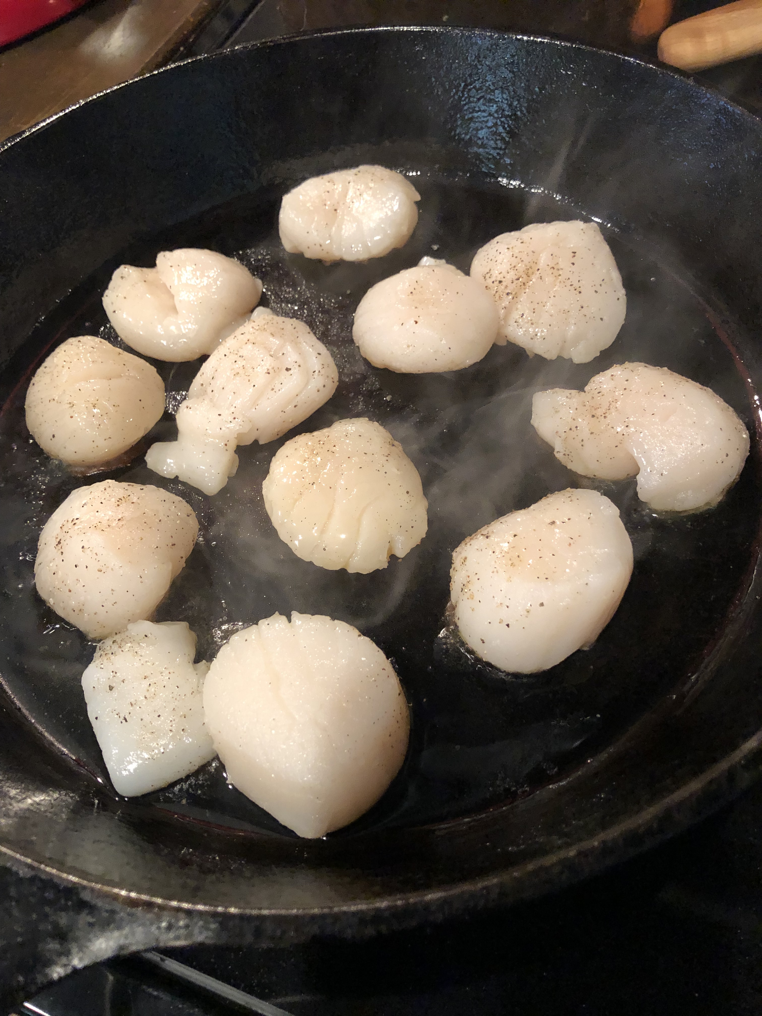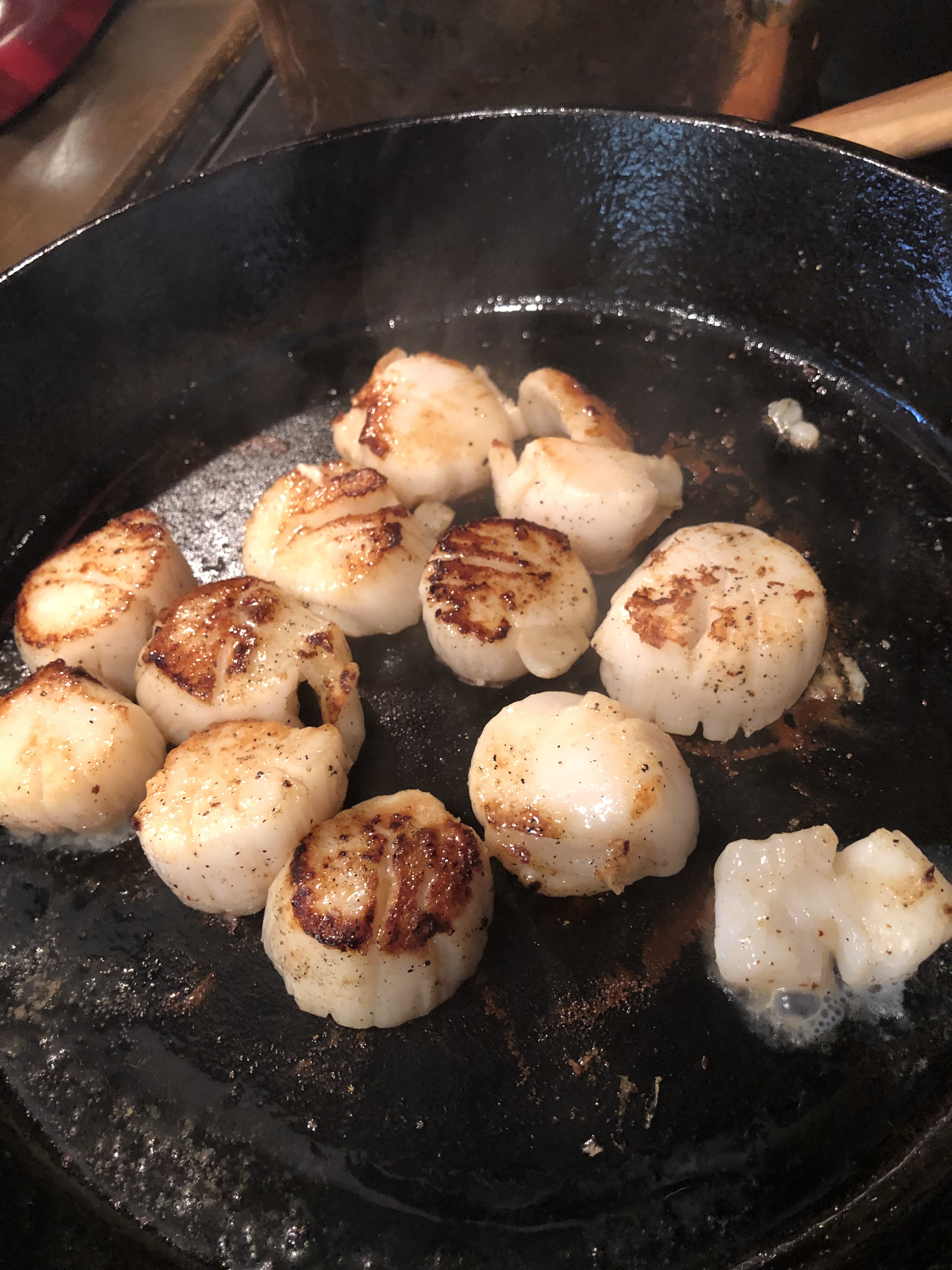 Of course, you are also welcome to pan fry. In case you are getting wind and rain like we were. Just pat dry, heat pan on medium high, add in olive oil (and a pat of butter if you are me), place scallops in the pan. Let stay with original side down for 2-3 minutes to achieve browning. After browned, flip and continue to brown for 2 minutes more.