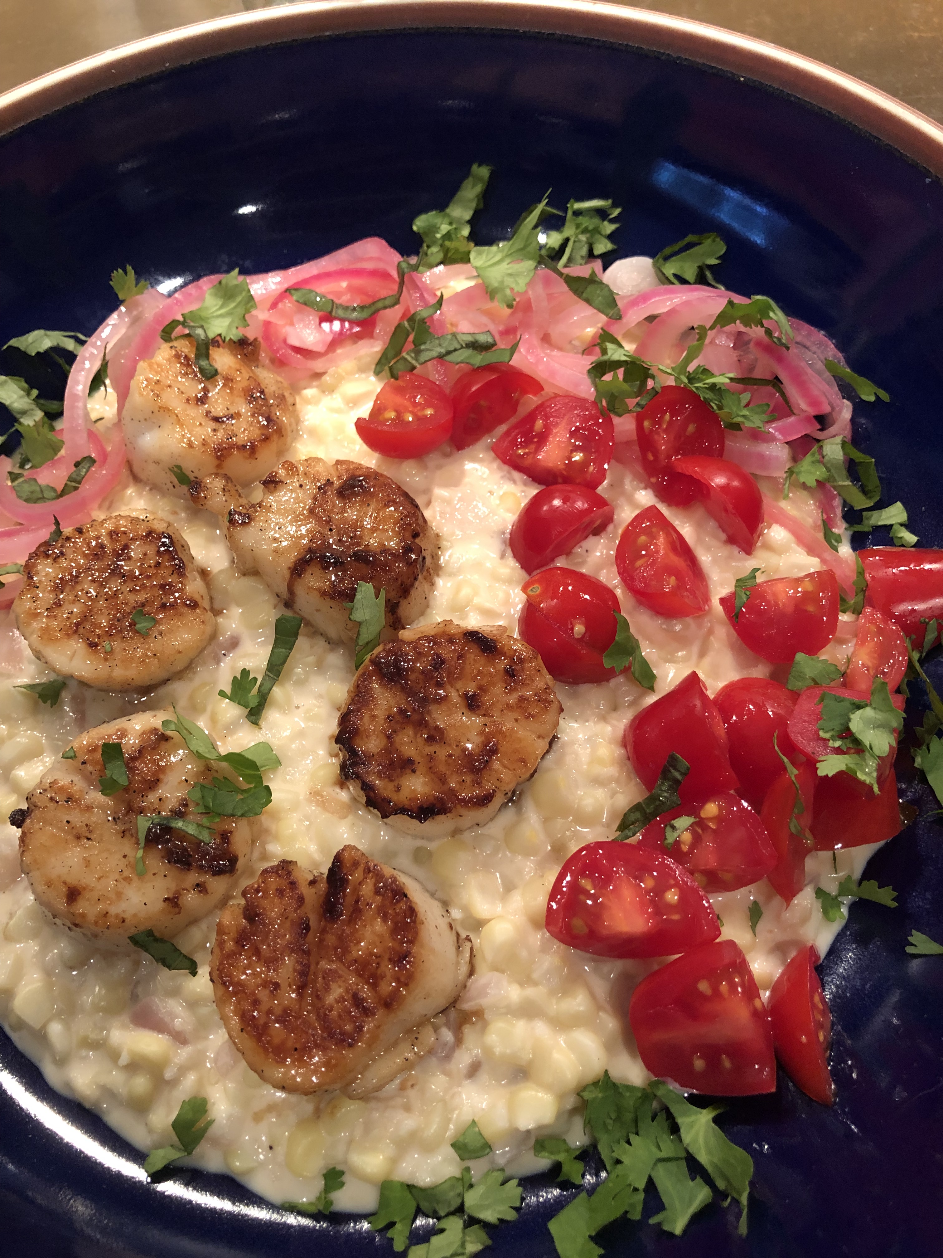 Place a ladle or so of creamed corn mix to a plate. Place 1/4 of the scallops on top of creamed corn to one side. Add a 1/4 of the tomatoes next to the scallops. Next, place some of the pickled onions next to the tomatoes. Top with the some of the basil, and cilantro.